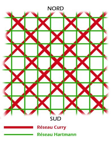 Le réseau Curry est au contraire du réseau Hartmann, orienté selon les médiannes des points cardinaux ( NE-SO